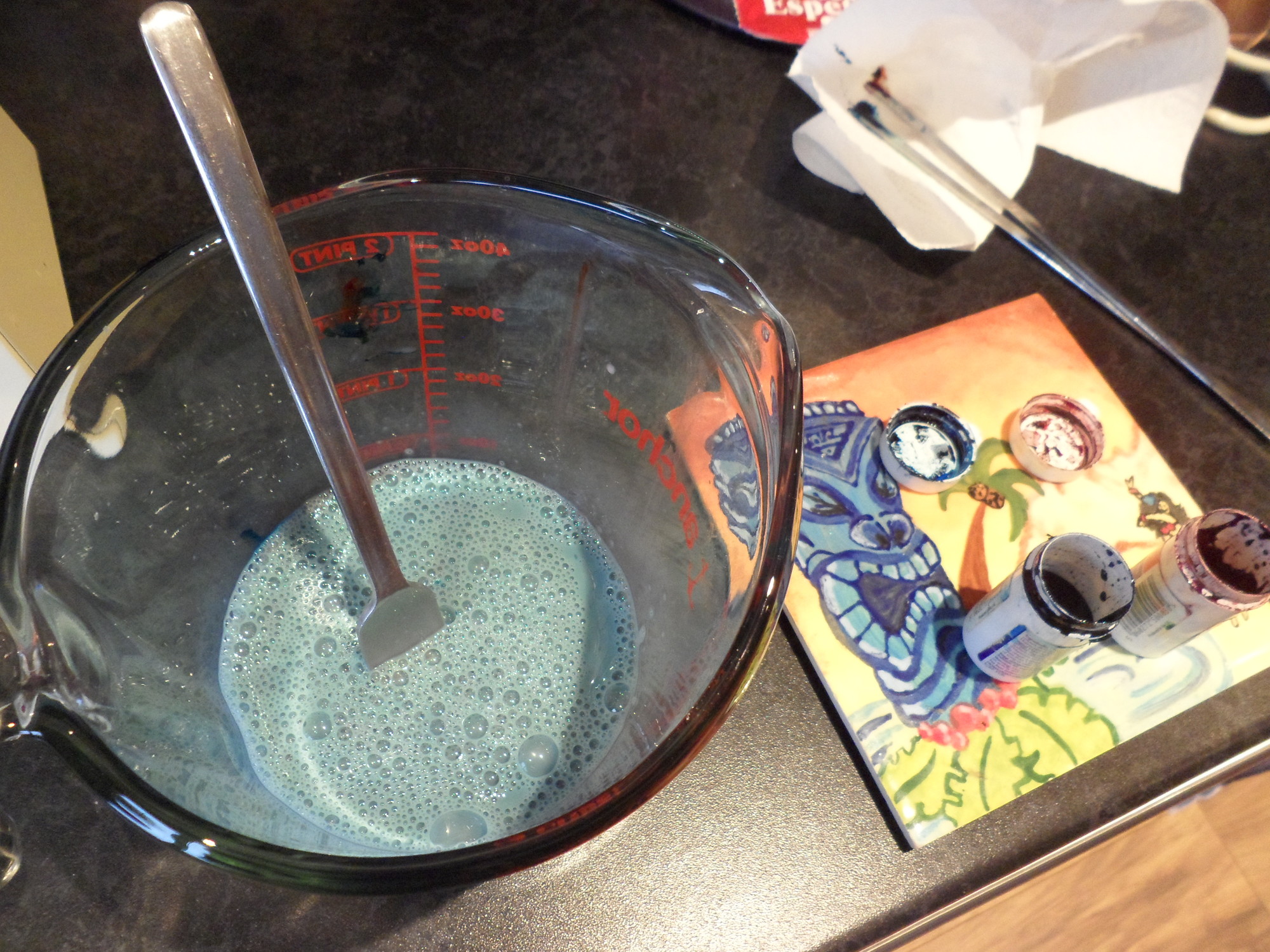 Whisk in to the eggs, milk and vanilla essence to make a murky colour…this should (hopefully) look more purple when baked
