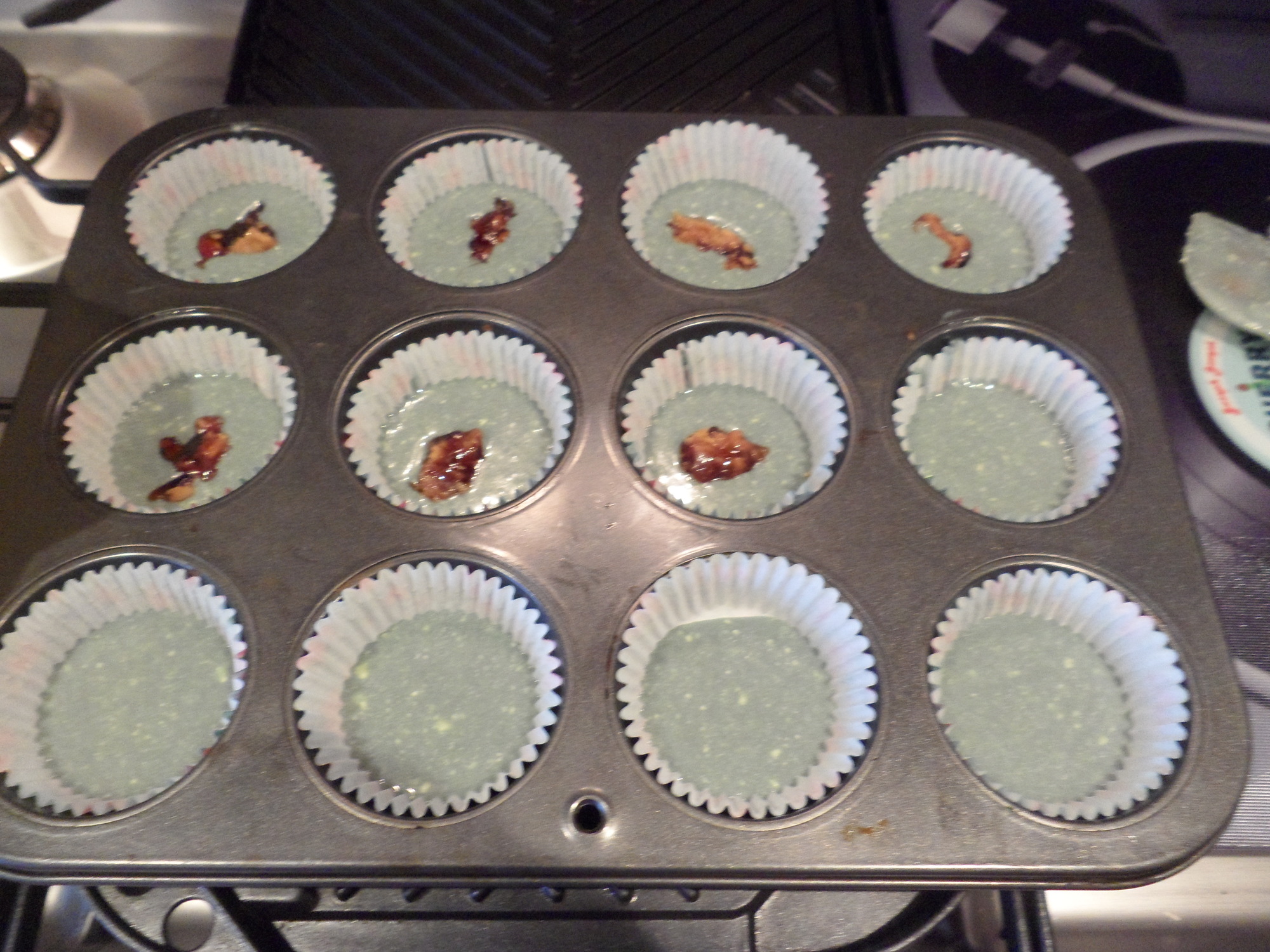 Fill a cupcake tray with pretty cases, add a spoonful of mix and then 1tsp of Goober. Try to get a jam and PB mix in there to ensure tastiness.
