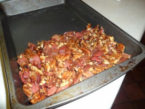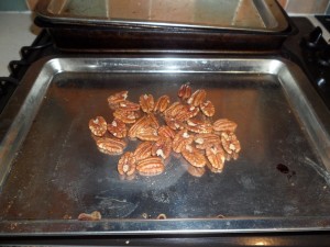 - Lay out the pecans on a tray and place in the oven for 10mins.