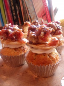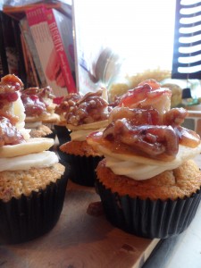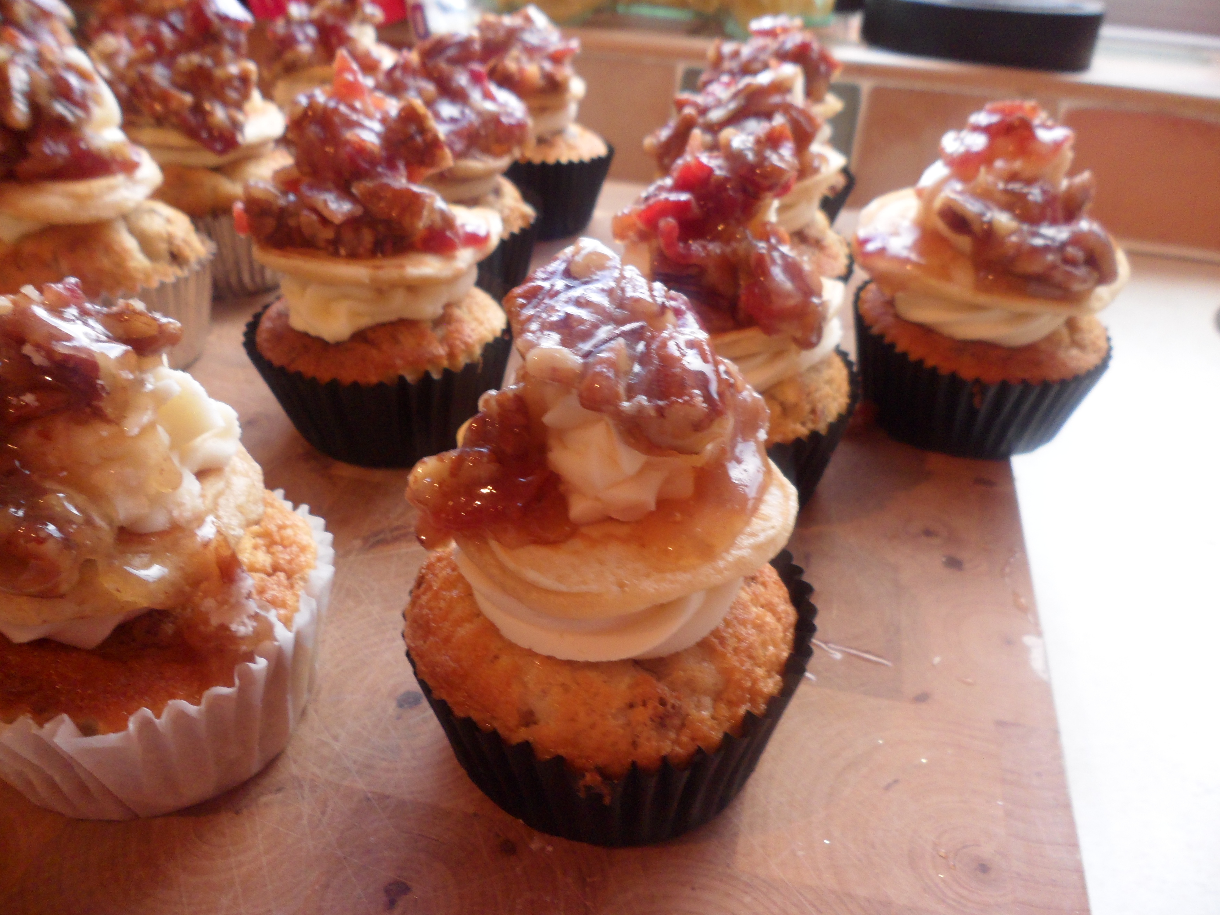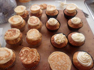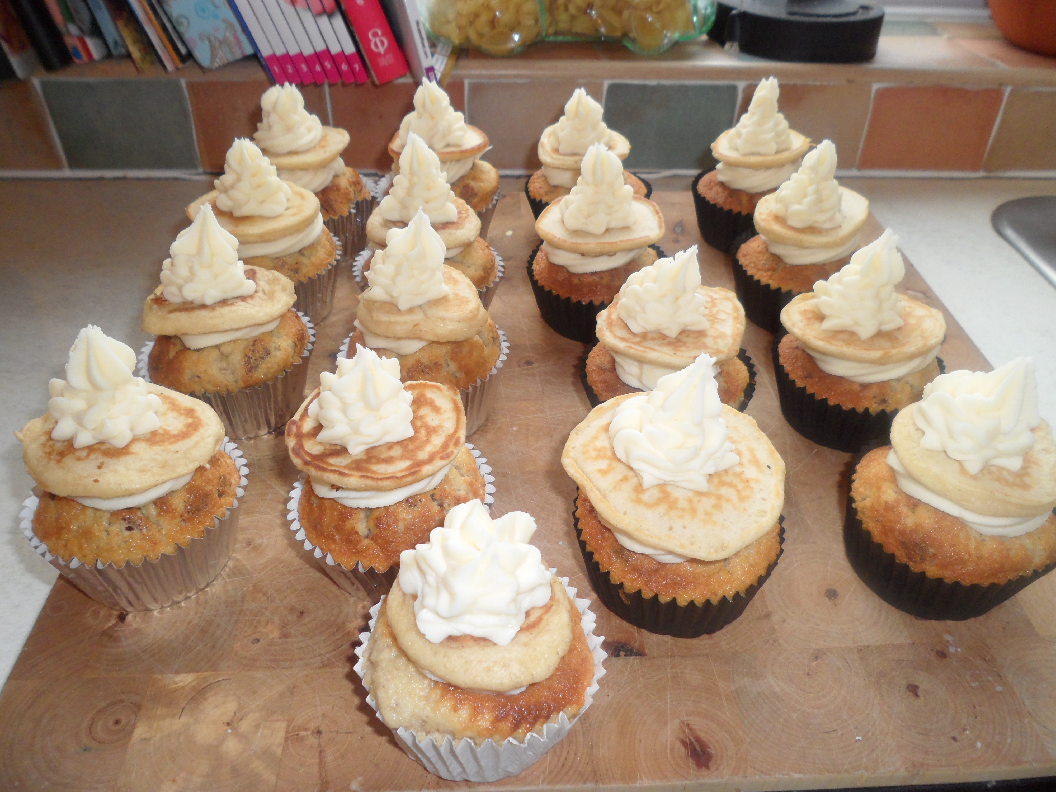 First of all you can start the day before for these (if you have the time – if not just pop the brittle topping in the freezer to speed up the setting process). The topping is a great selection of flavours however I made it by sheer fluke before setting up my blog and stupidly didn’t write down the recipe; consequently this batch didn’t taste as great as the original…let me know if you can get it to set with more structural integrity! You can make the pancakes and cupcakes on the day you intend to give them to people, but I would suggest either refrigerating them or keeping them somewhere cool so they don’t droop!