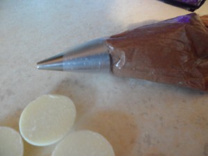 - Put 2tsp of frosting in to a bowl with a bit of red food colouring and then transfer to a piping bag with a small nozzle.