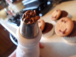 - Now scoop the remaining mix in to a piping bag with a grass nozzle. Pipe a bit on to each cake to secure the Jaffa Cake and then pipe hair around this.