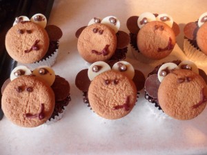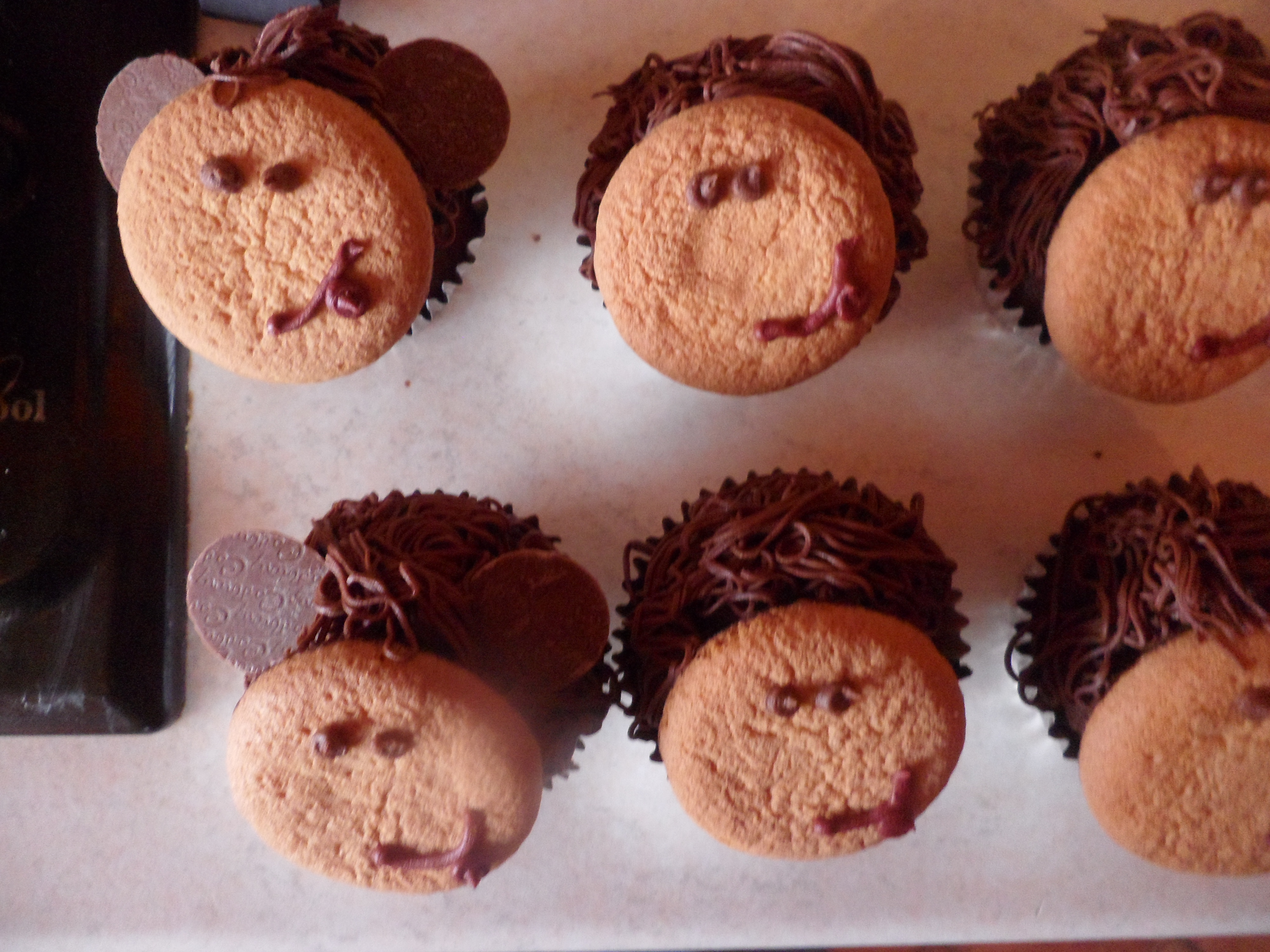 These are a fun little bake and surprisingly easy to make even though the washing up afterwards is quite excessive! You can change ad tweak little things like the features or even make an orange coloured frosting and make these chaps Orang-Utangs instead!
