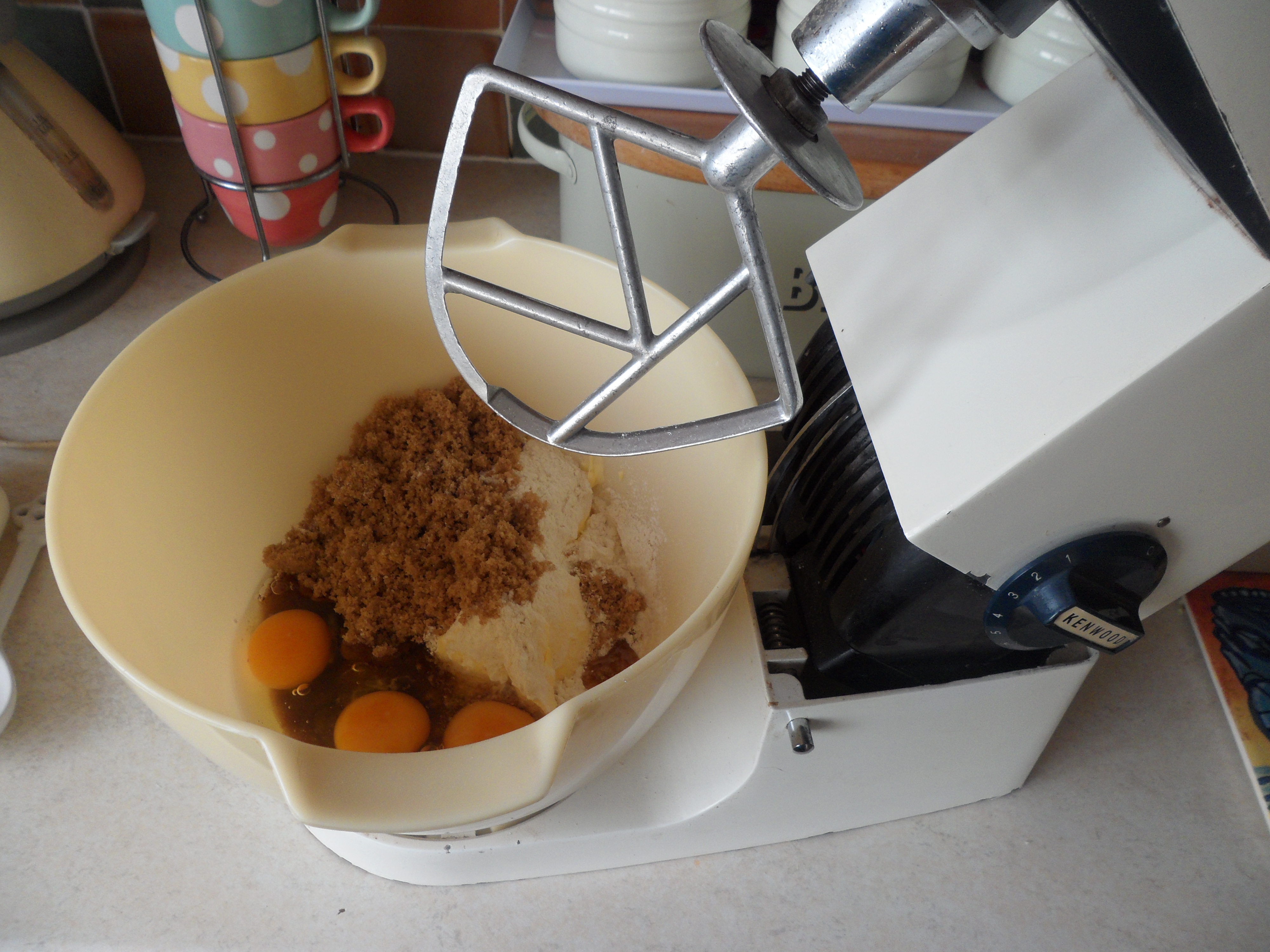 - Place the stork, brown sugar, baking powder, flour, eggs and milk in to a mixer and set on medium speed. Switch off once it is all combined.
