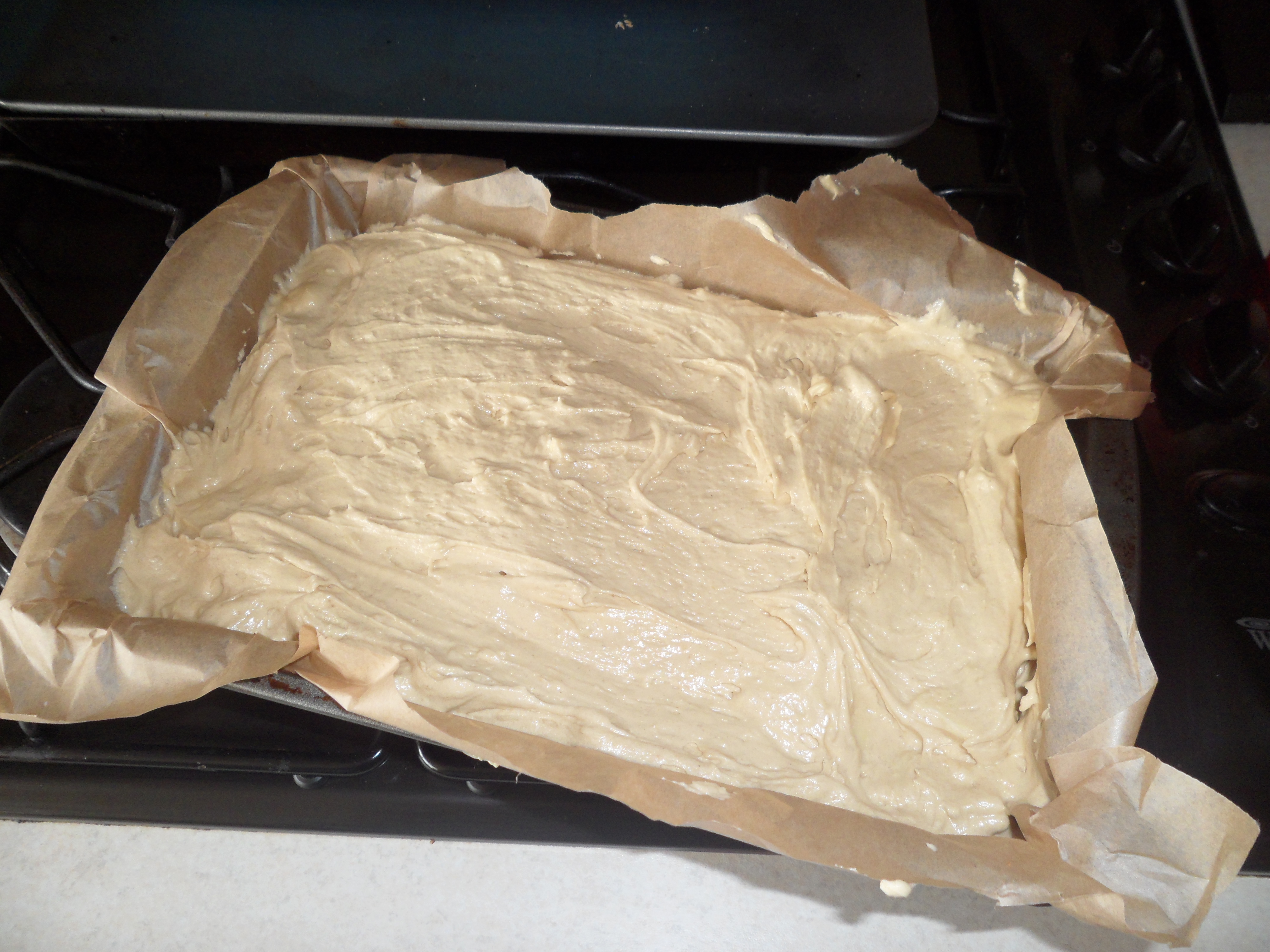 - Preheat the oven to 180c or 160c fan and line a shallow tin (20 x 24cm) with greaseproof paper.