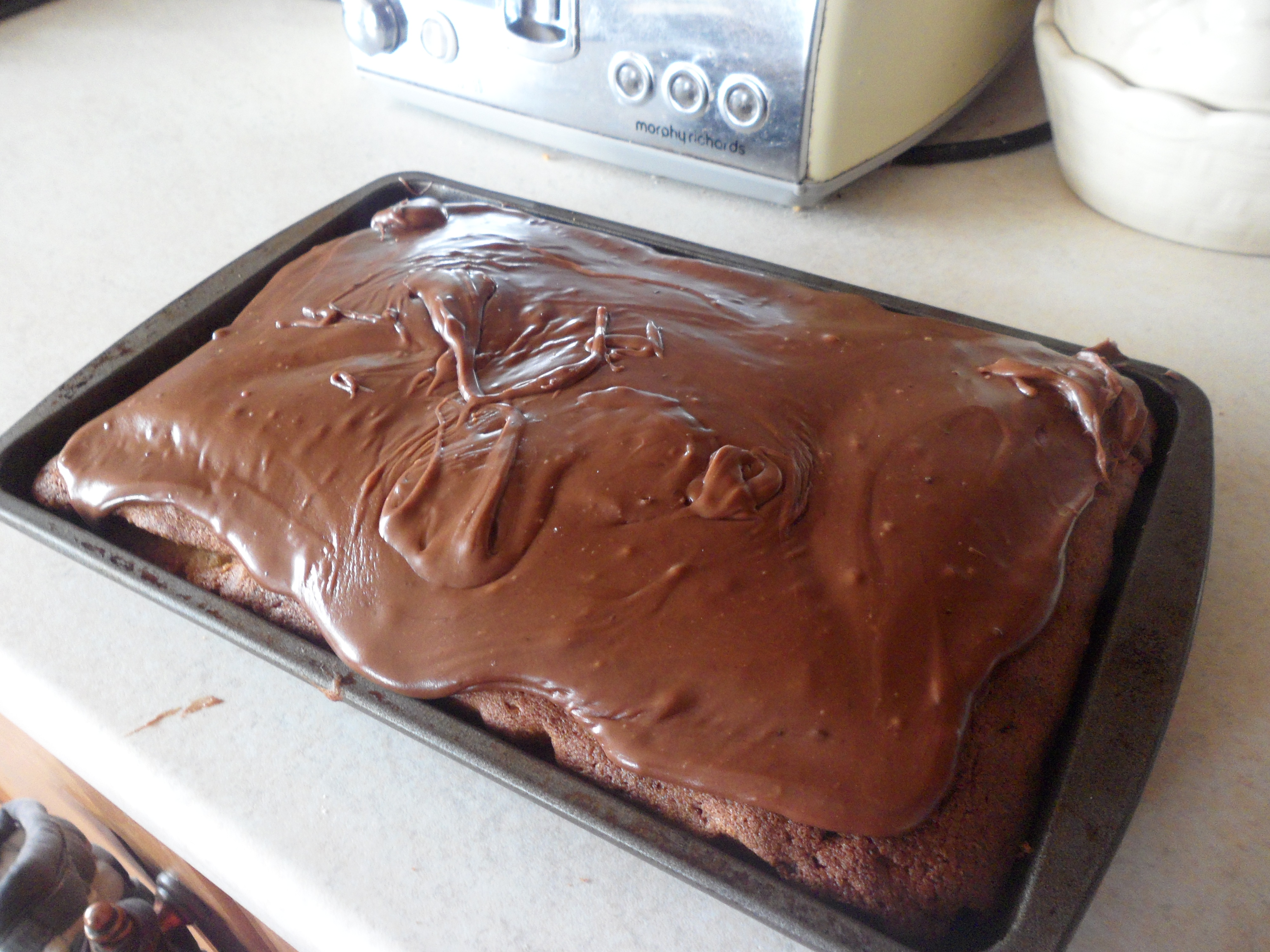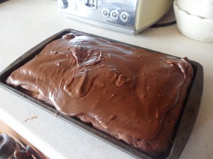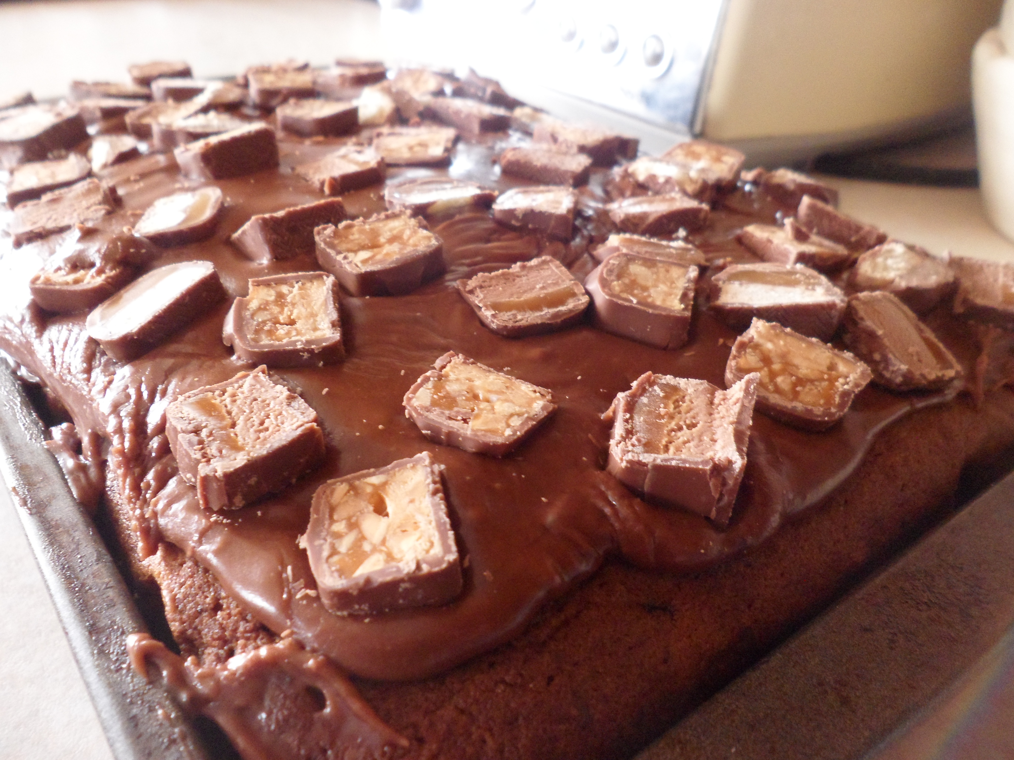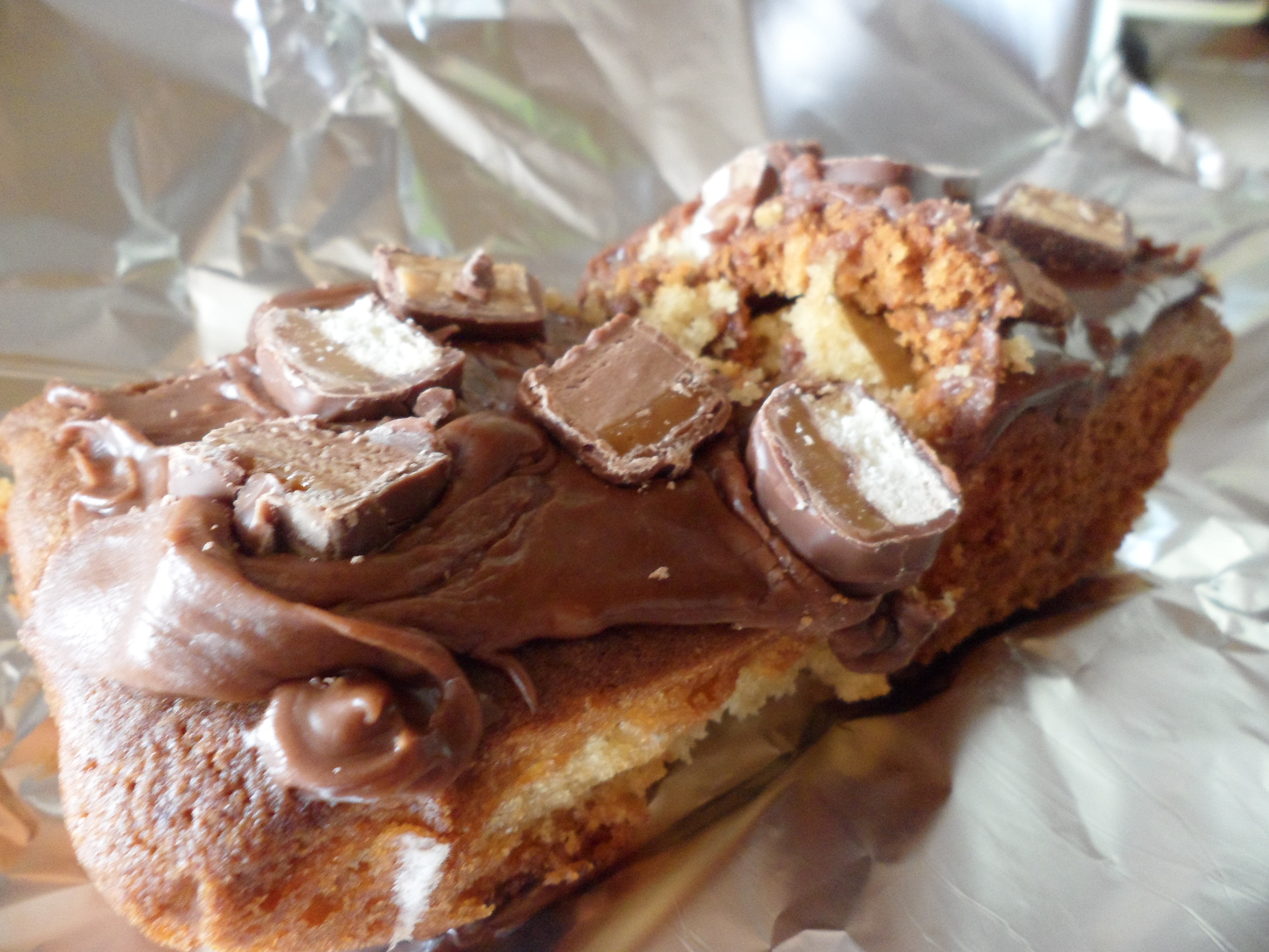 This morning it’s a modified ASDA magazine recipe called Fudge Cake Bars which i’ve topped instead with Celebrations – Mars, Snickers and Twix to be precise…