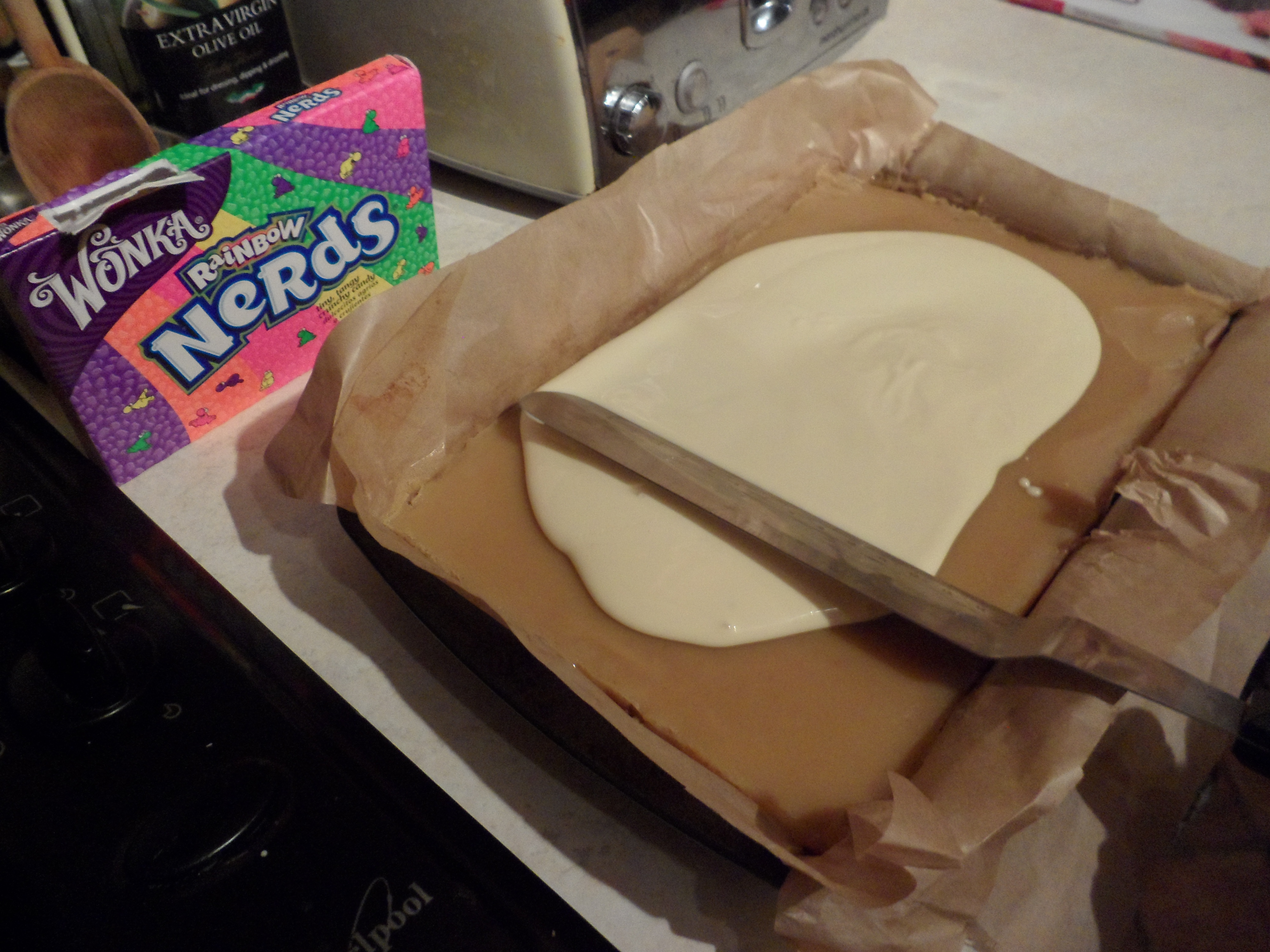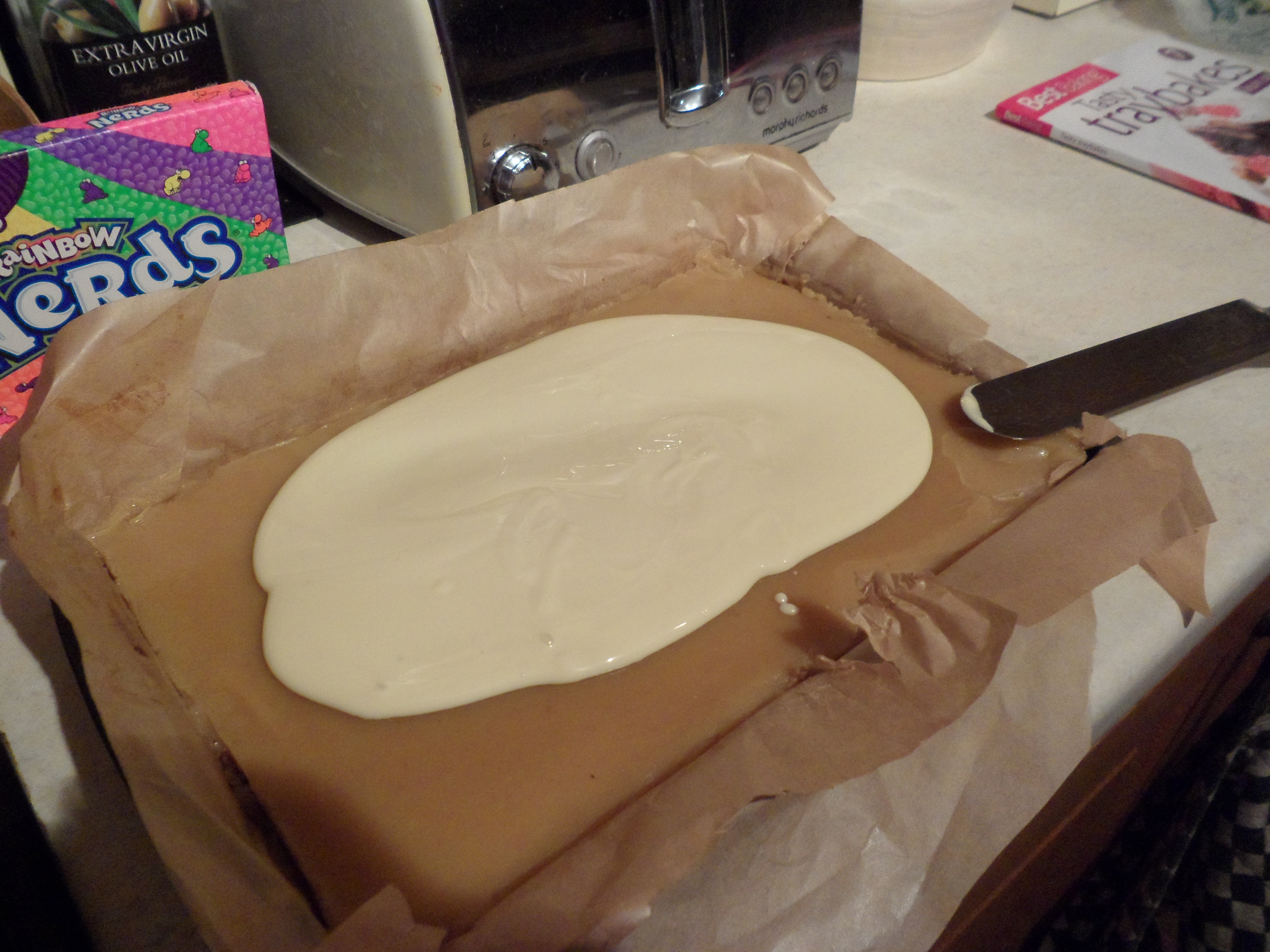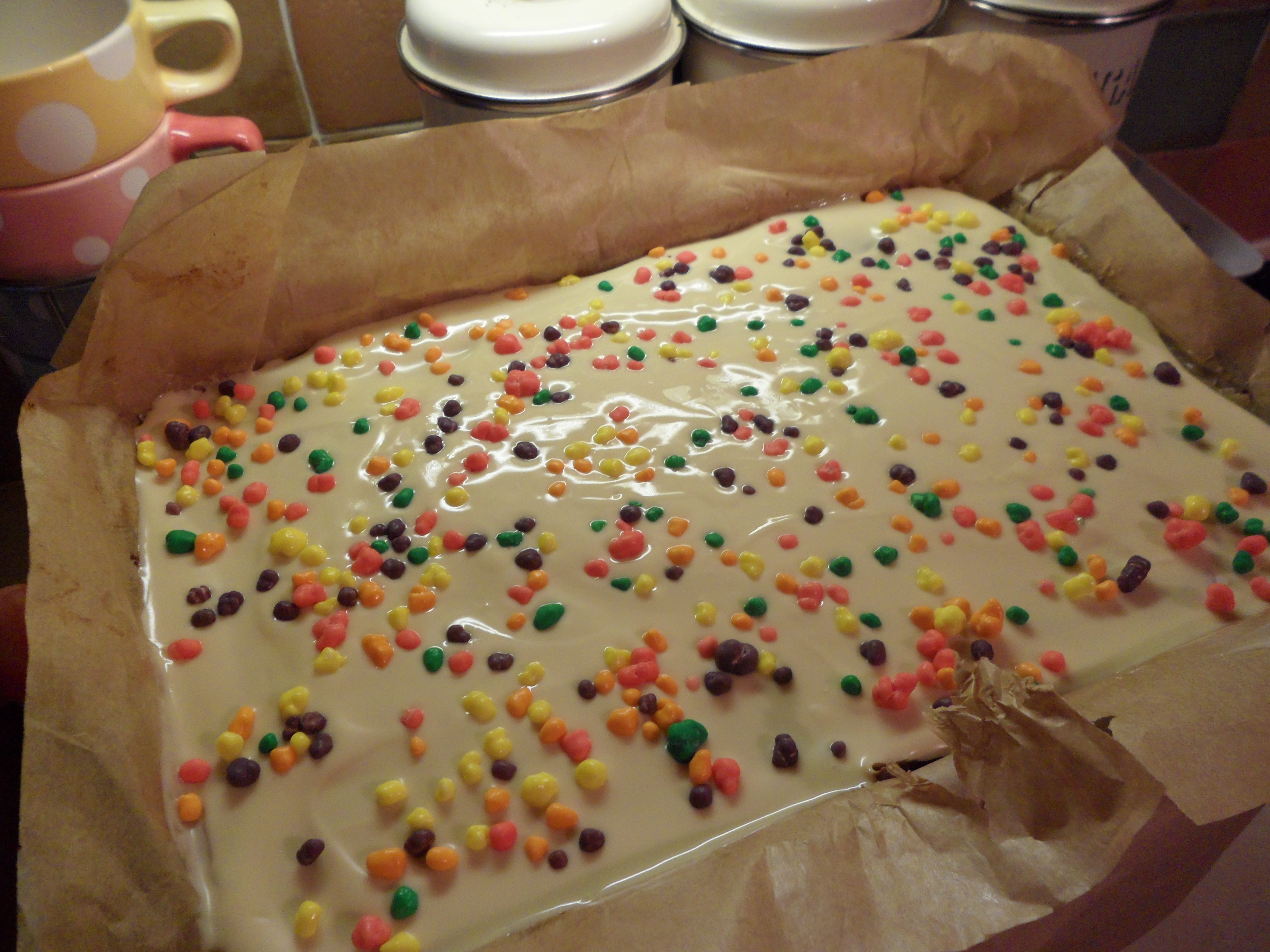 These went down a treat and the white chocolate worked much better with Nerds than milk would have done. Now to experiment with various other naughty toppings.