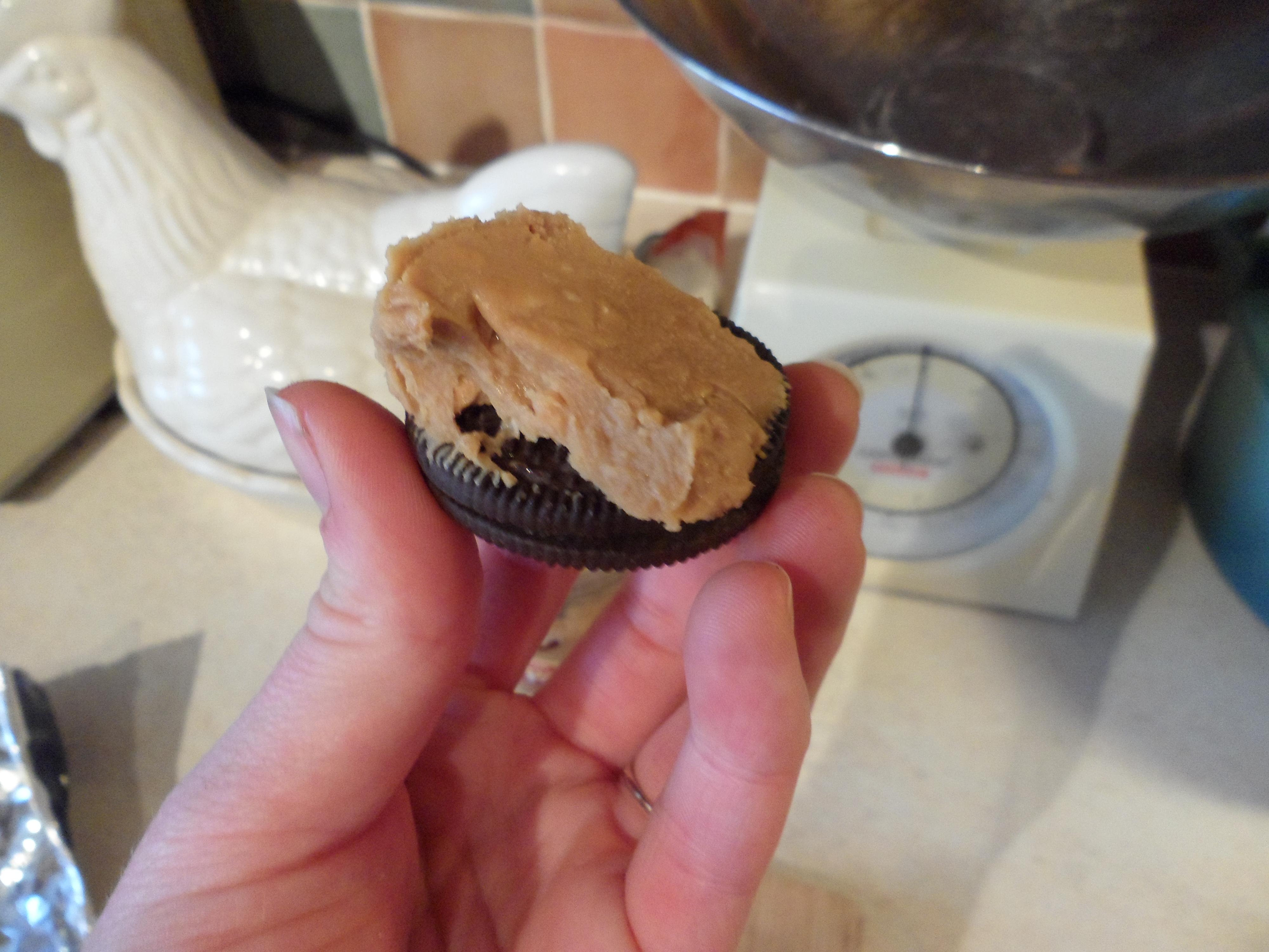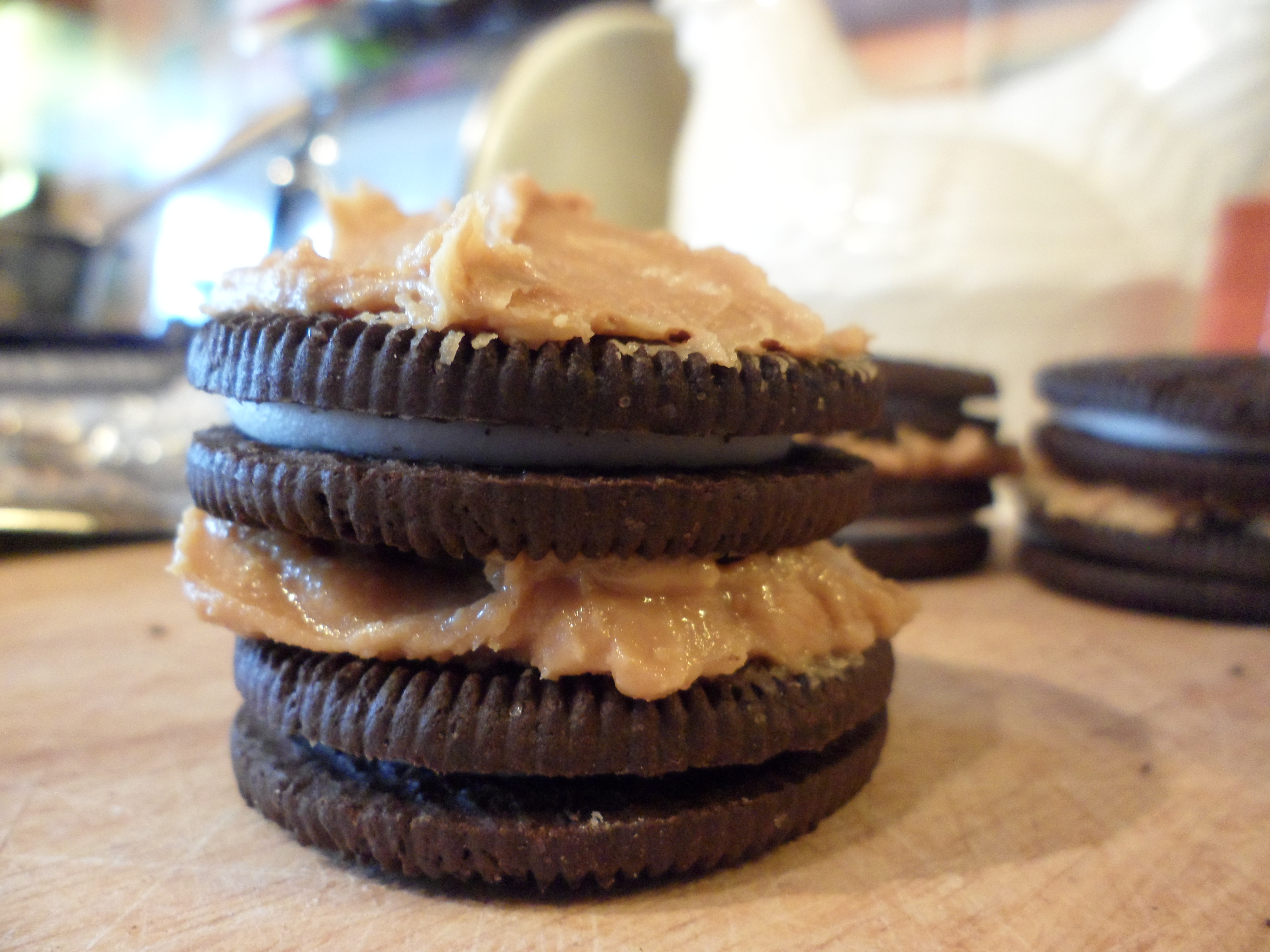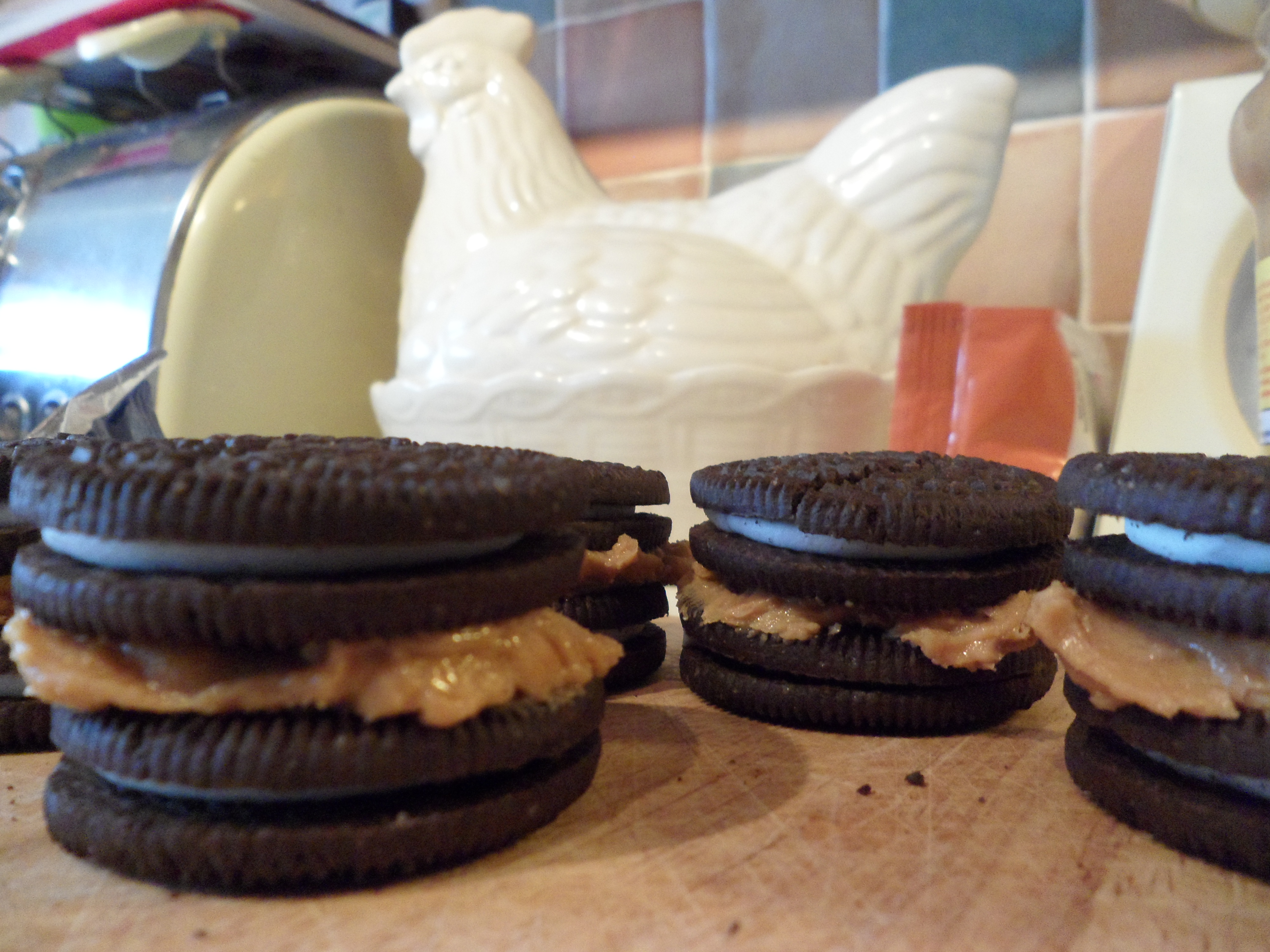 Cover one oreo in peanut butter – I’m a crunchy peanut butter fan so the finish is not of plasterer standard but has the same taste sensation effect!