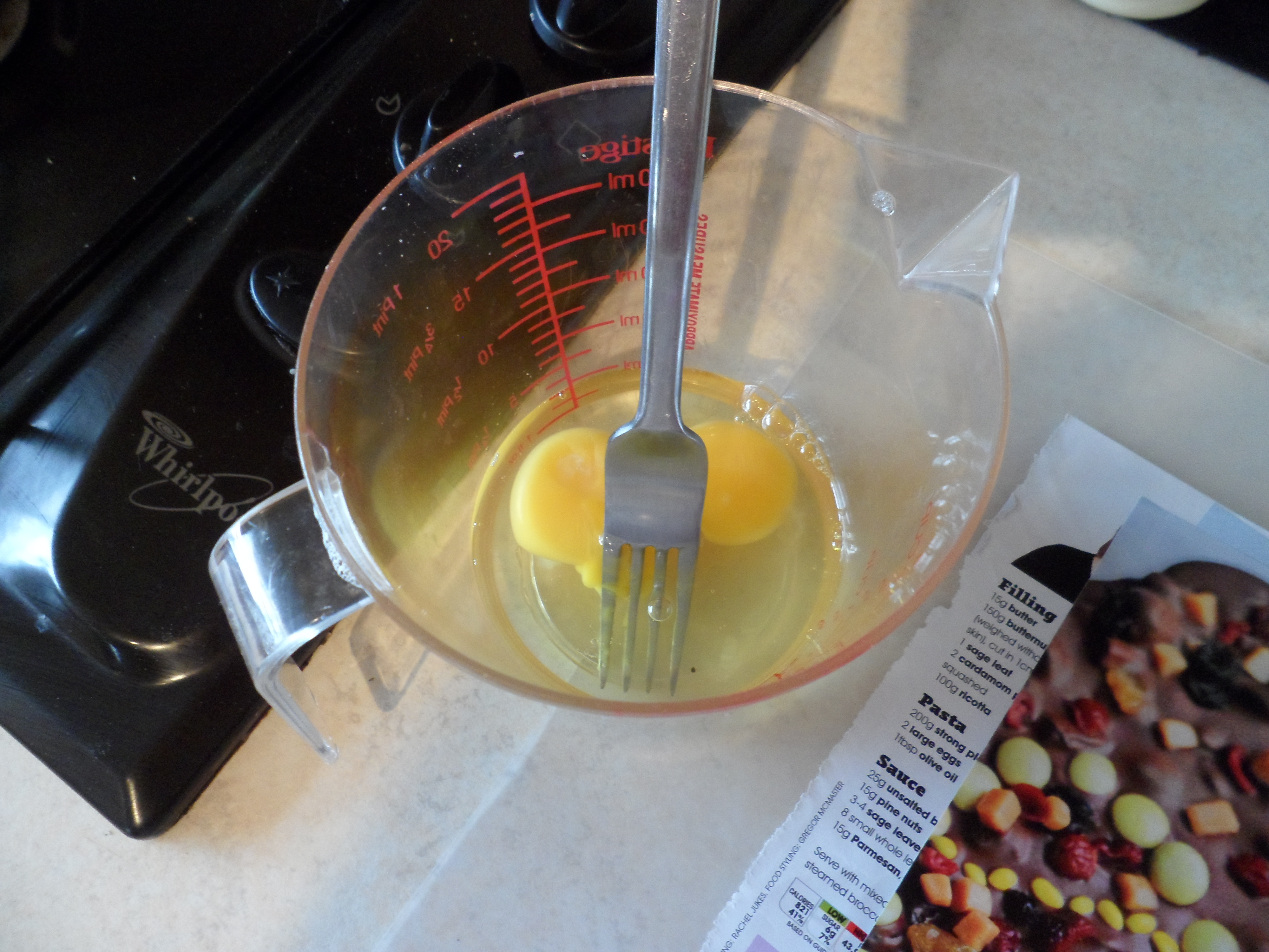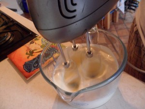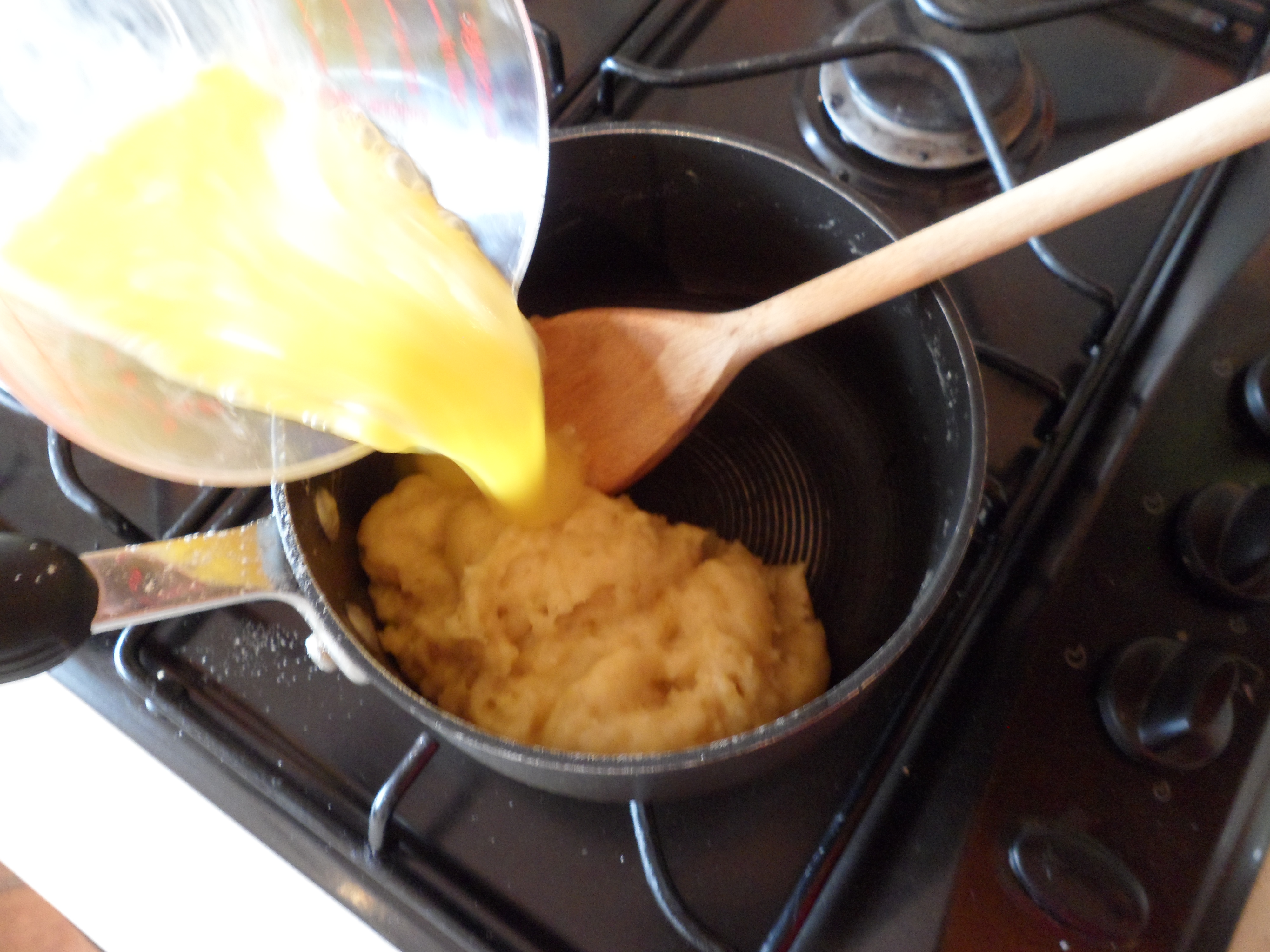 After the 10mins pour in half the egg mix and then beat it in….once combined add the rest and stir again