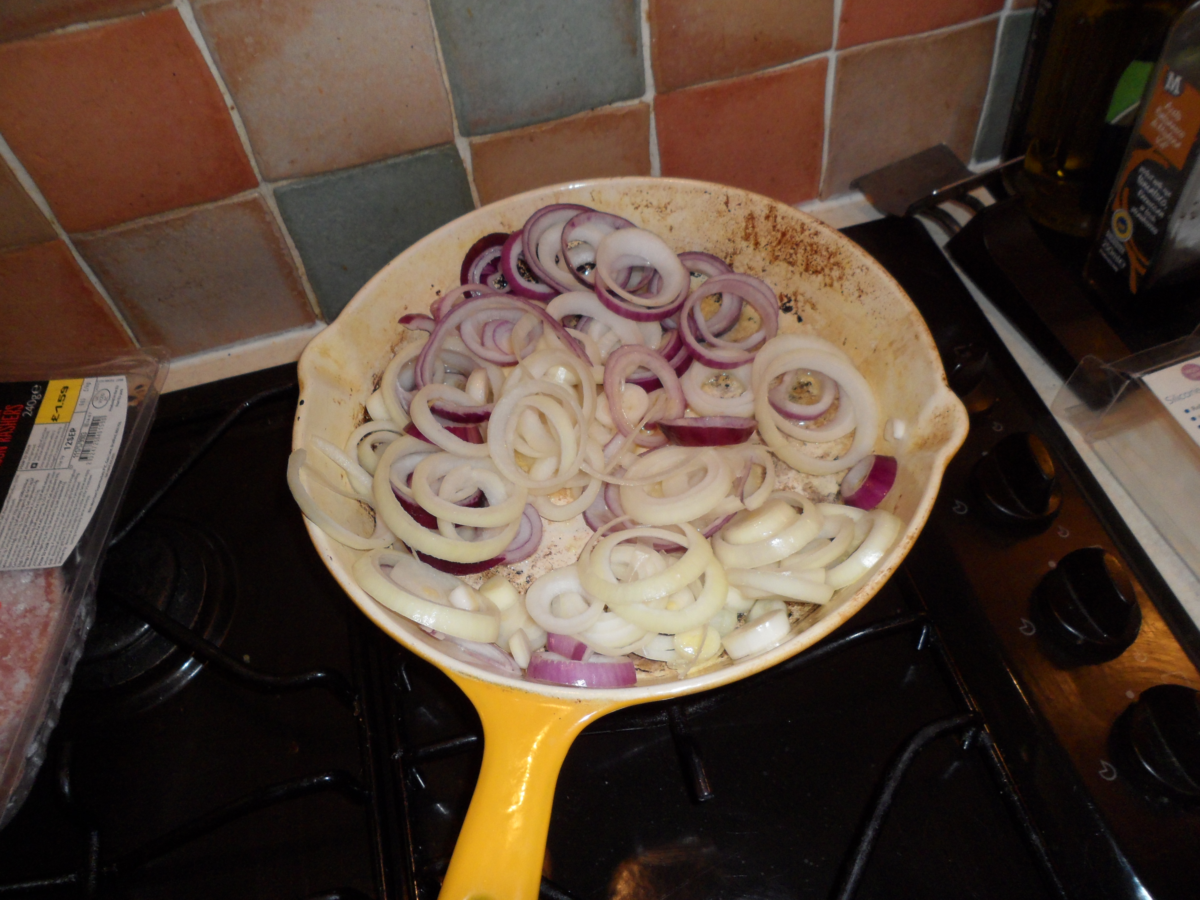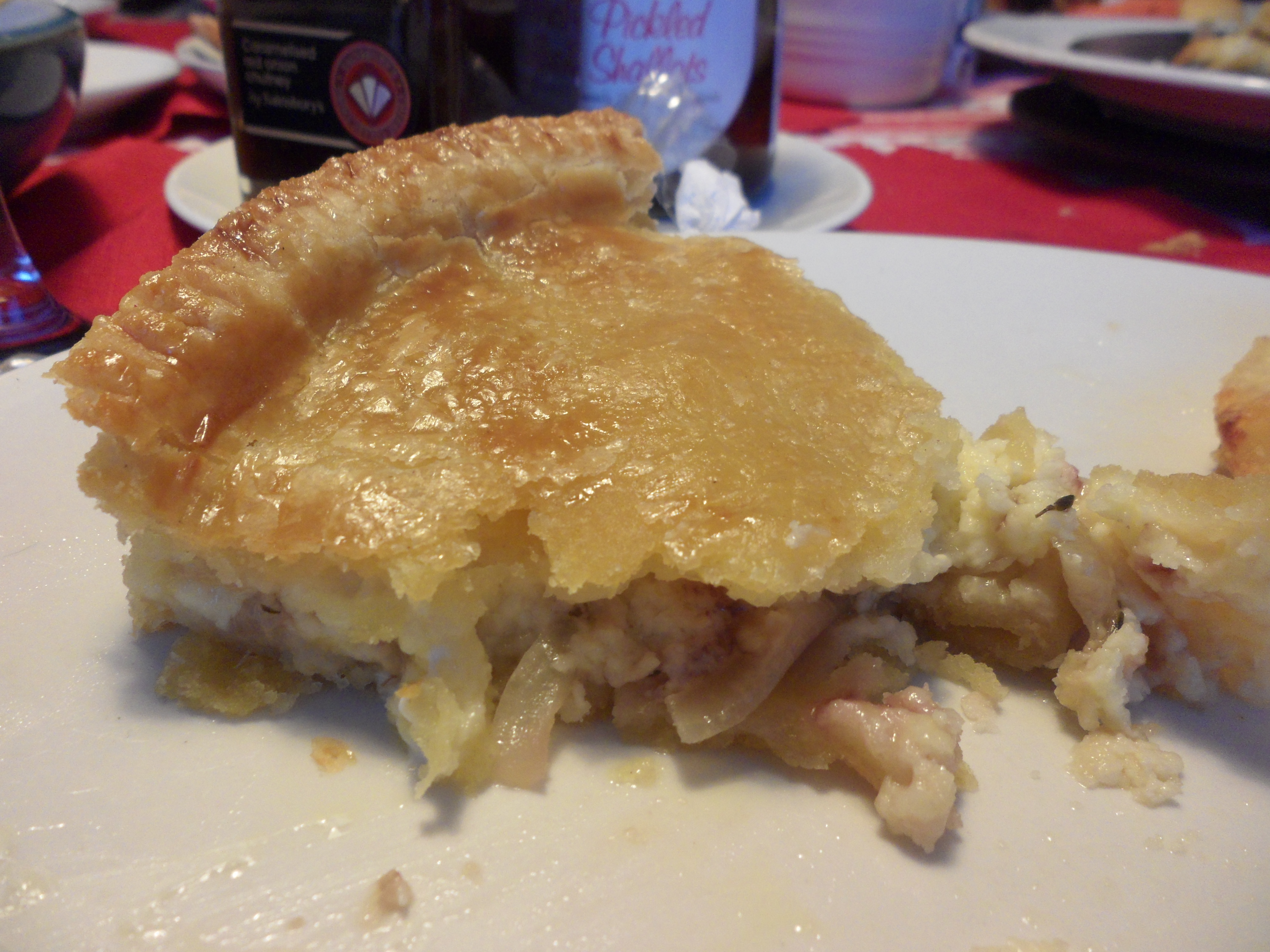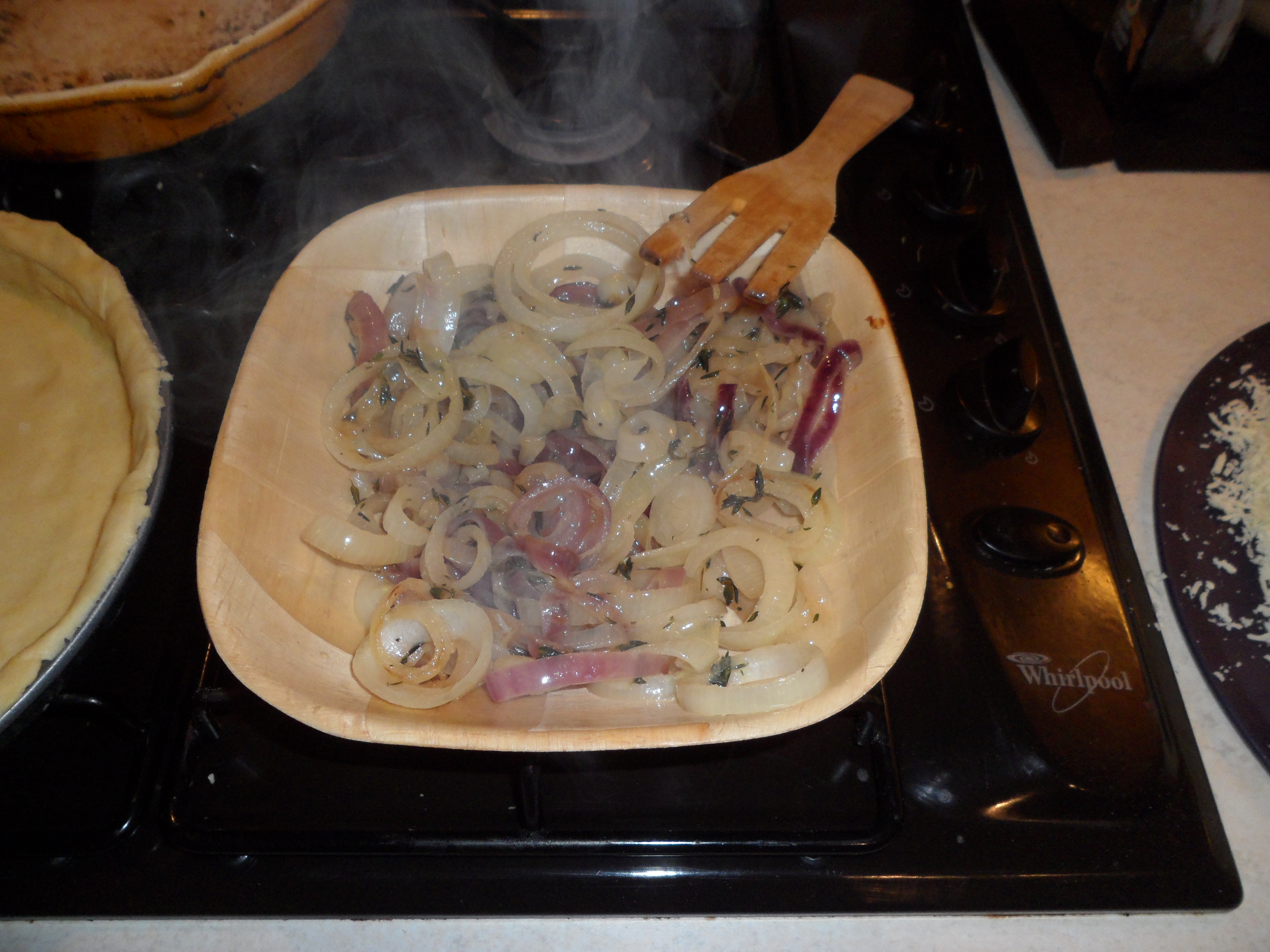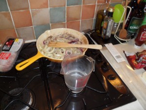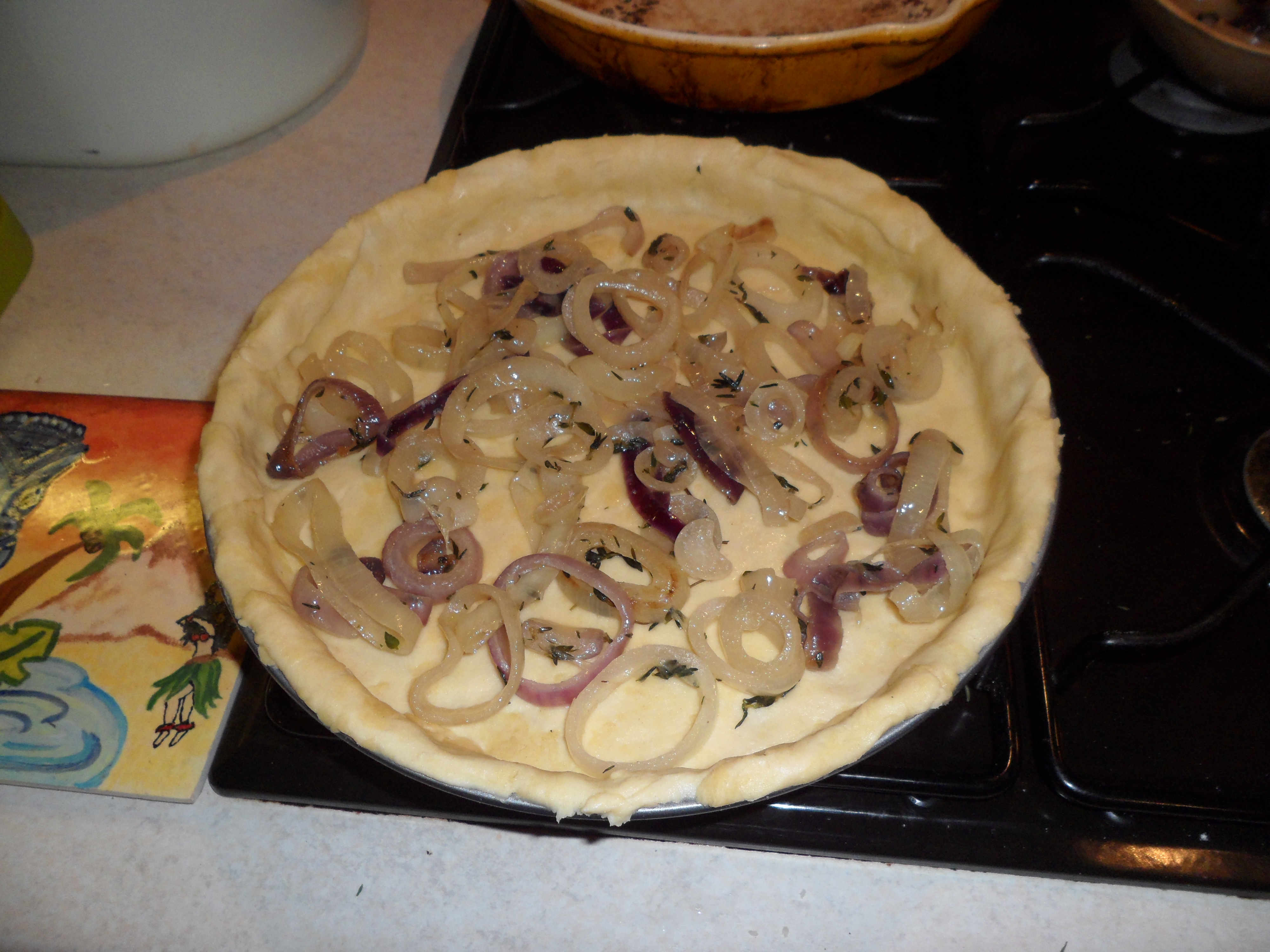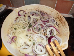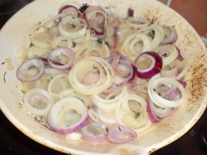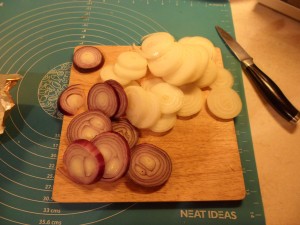 Now start to layer up the pie…start with the red and white onions (about a handful) scattered across the base