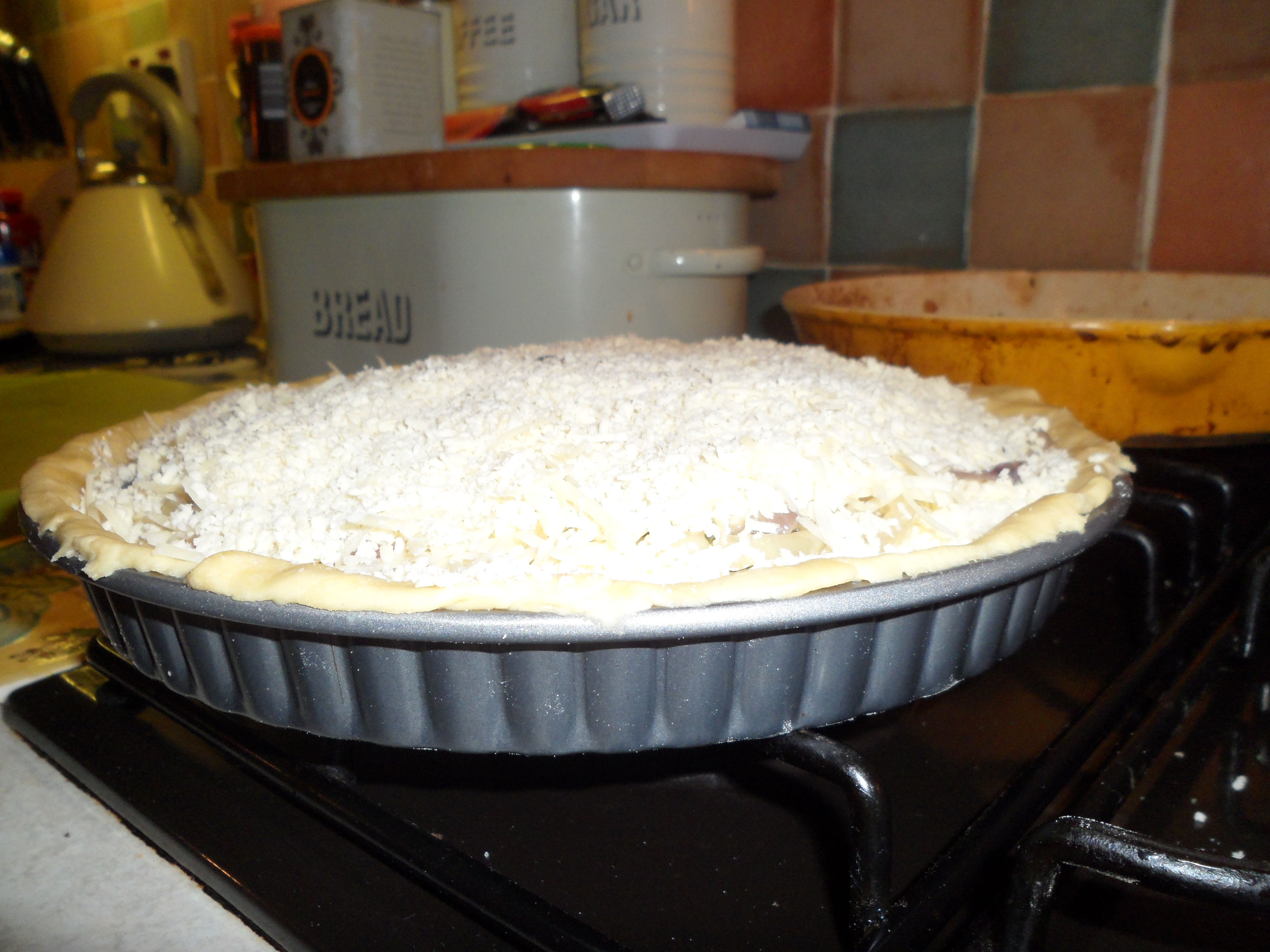 Now crimp around the edges or use a fork to press the edges together…I used the leftover trimmed edges to then make a mouse and cheese motif for the top – just to clarify there are NO MICE in this pie…just cheese and onion ;)