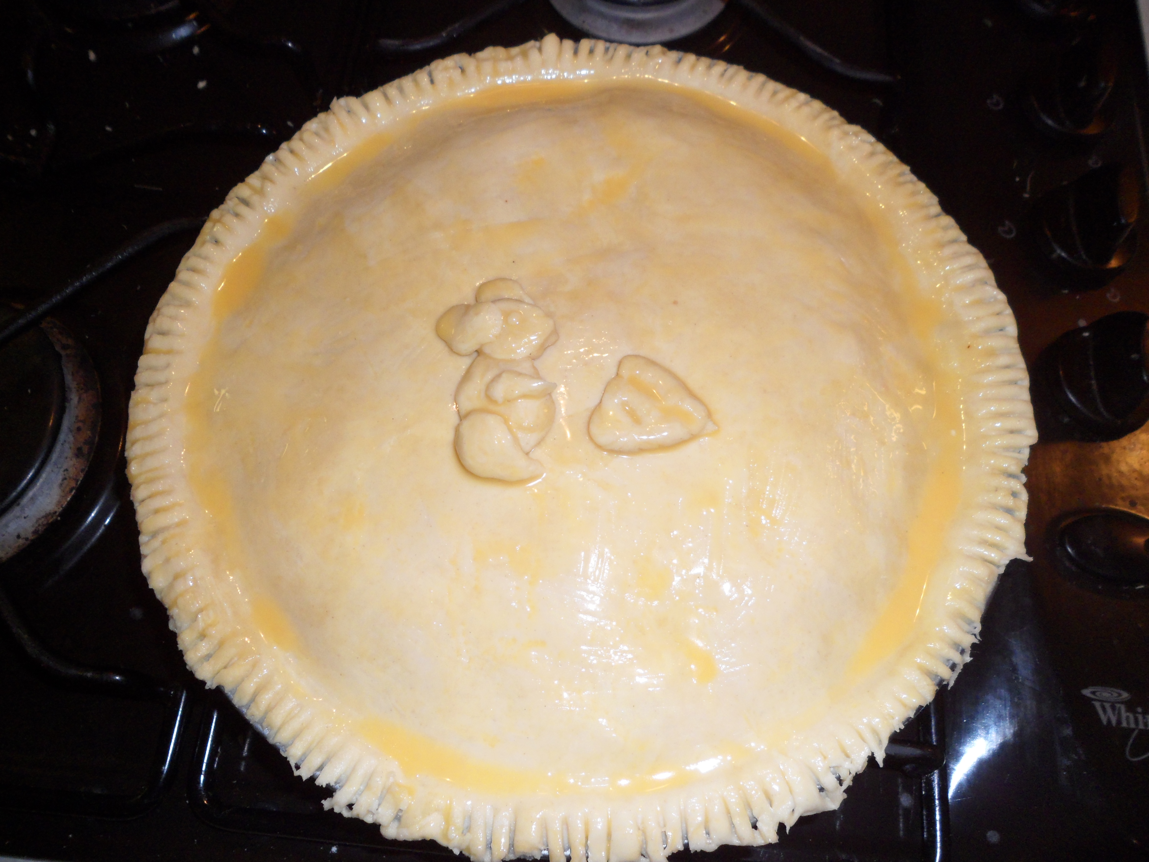 Now for the lid…remove one side of the cling film…whisk an egg and brush the edges of the pie base…place the lid over the top and remove the top cling film
