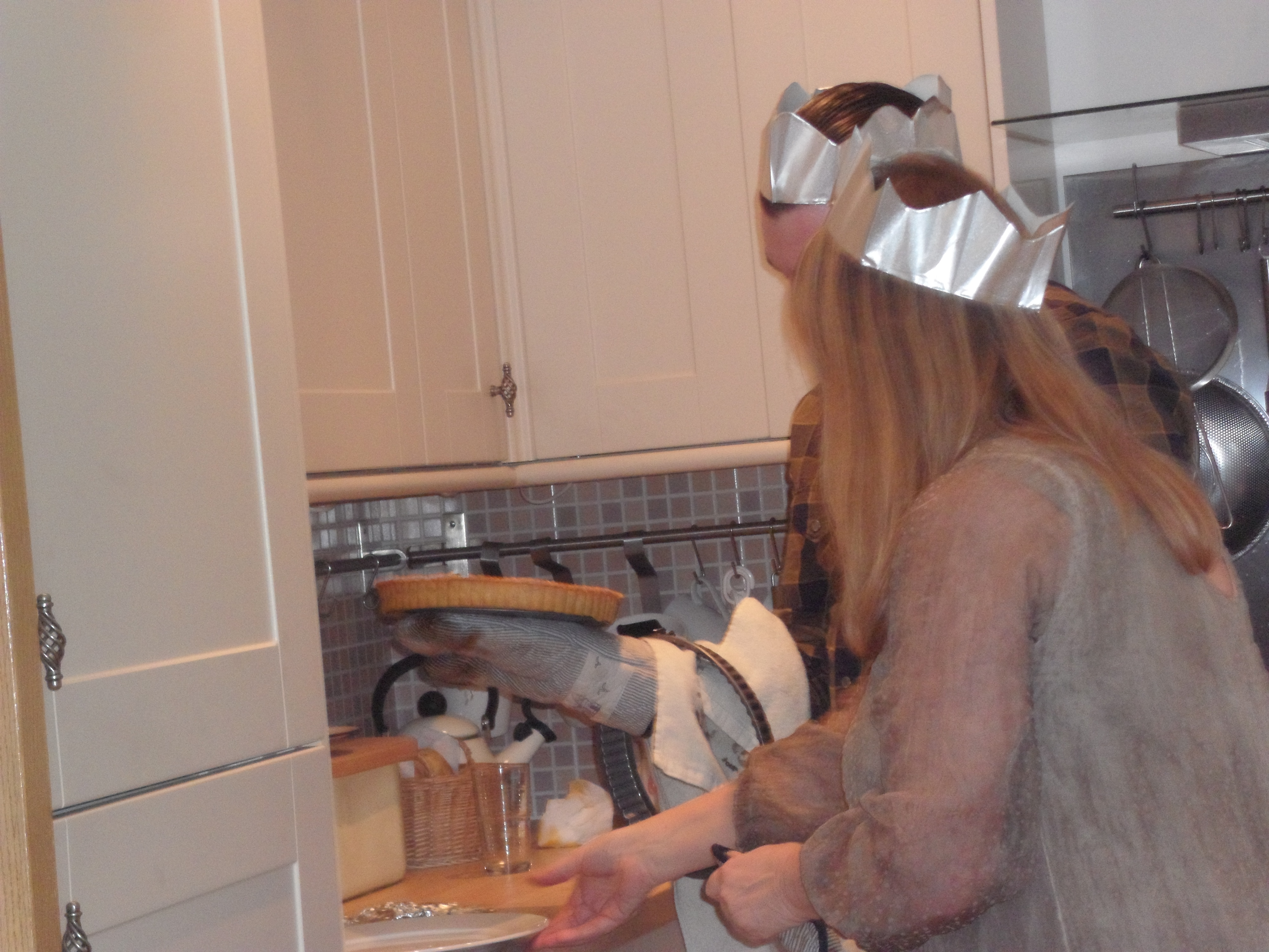 Pie tin removal may be tricky with loose bottomed tins…a series of oven glove balancing techniques and supportive guidance helps :)