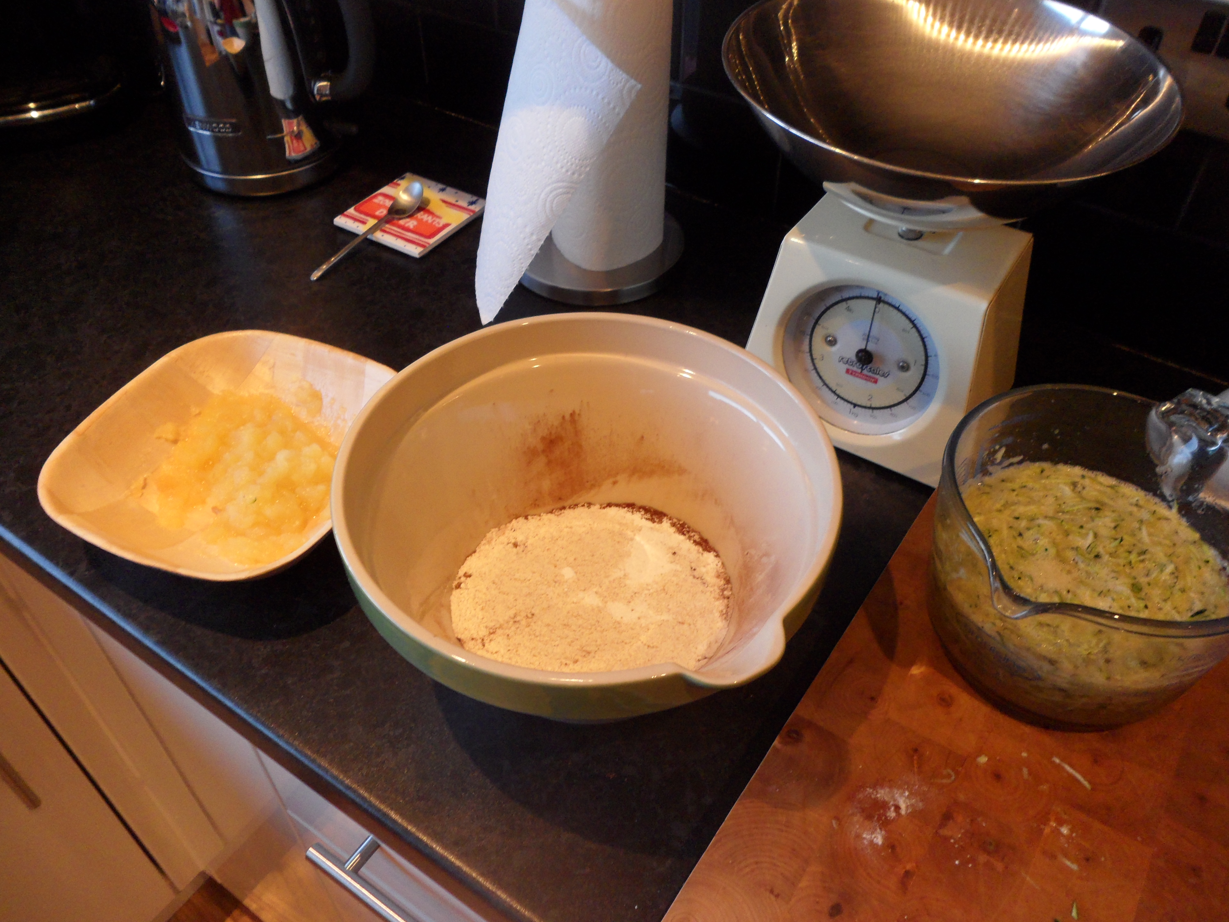 Measure out your sugar, vanilla essence and add to the courgette and eggs – stir until fully combined – stir through the cooled apple sauce and set aside!